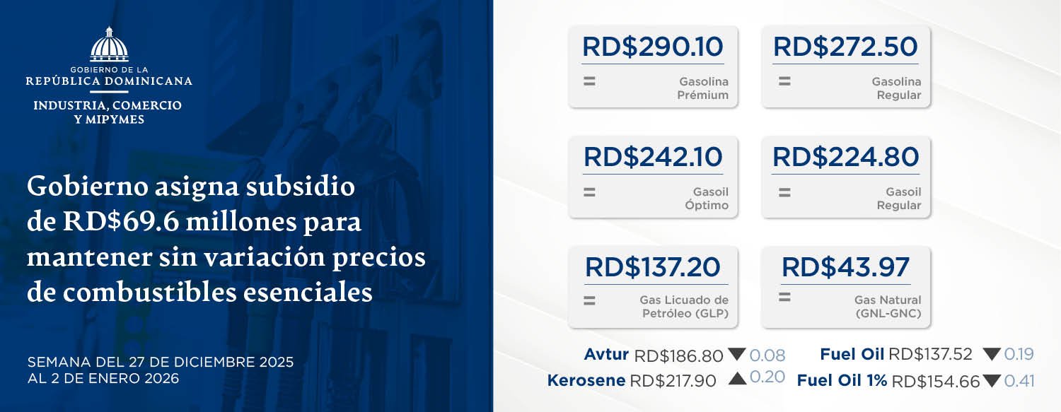 El Gobierno dispuso un subsidio de RD$69.6 millones para mantener sin variación los precios de los combustibles esenciales durante la semana en curso. La medida, comunicada por el Ministerio de Industria, Comercio y Mipymes (MICM), busca contener presiones sobre el costo de vida y dar certidumbre a hogares y sectores productivos en plena temporada navideña.