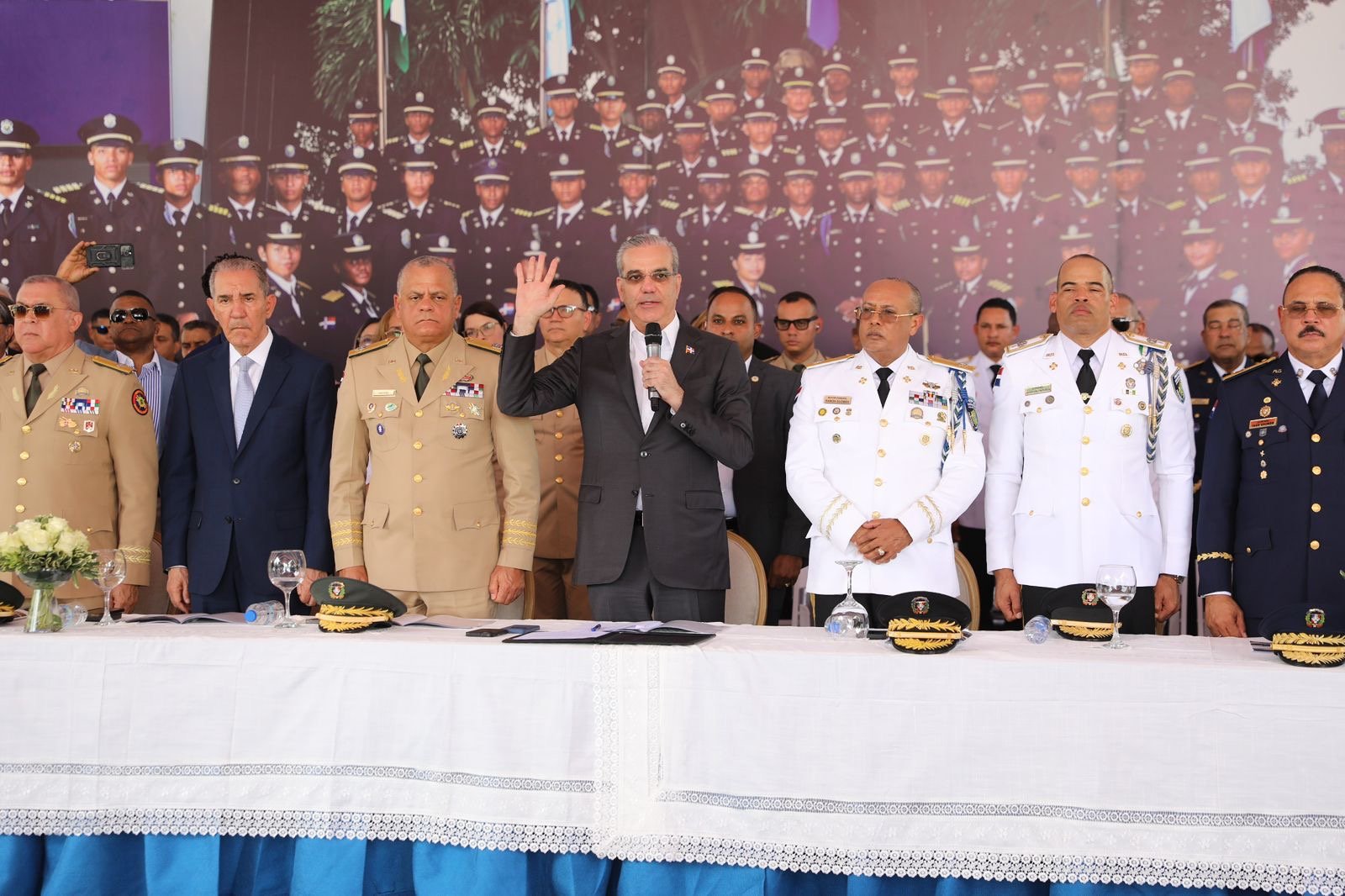 El jefe de Estado estuvo acompañado por los ministros de Defensa, teniente general Carlos Antonio Onofre Fernández; de Educación Superior, Ciencia y Tecnología, Franklin García Fermín; del viceministro de Seguridad Interior, Antonio Palma en representación de la ministra de Interior y Policía, Faride Raful; el director general de la Policía Nacional, mayor general Ramón Antonio Guzmán Peralta y el subdirector general de la institución, general Juan Hilario Guzmán Badia.